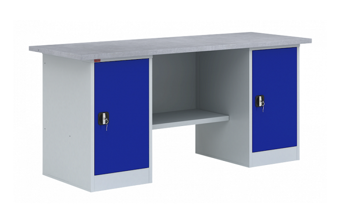 Металлические слесарный верстак ВП-5/1,6 представляет собой рабочий стол для ручной обработки металлических, деревянных изделий, а также предметов, выполненных из других материалов. Металлический верстак используется в мастерских, гаражах, автосервисах и в других рабочих зонах. Он являются основой, как небольшого промышленного производства, так и крупного предприятия. Допустимая равномерно распределенная нагрузка на верстак - 1000 кг, на полку верстачную - 40 кг, на полку тумбы Т-1 - 30 кг. В комплект верстака ВП-5/1,6 входит: столешница СТ-1,6 из МДФ, покрытая оцинкованным листовым металлом, стенка задняя металлическая, две тумбы Т-1 с двумя съемными полками. Тумбы закрываются ключевым замком. Дополнительно на верстак можно установить перфорированный экран соответствующего размера, аксессуары на экран. Цвет: верстак - серый Ral 7035, дверь тумбы - синий Ral 5002